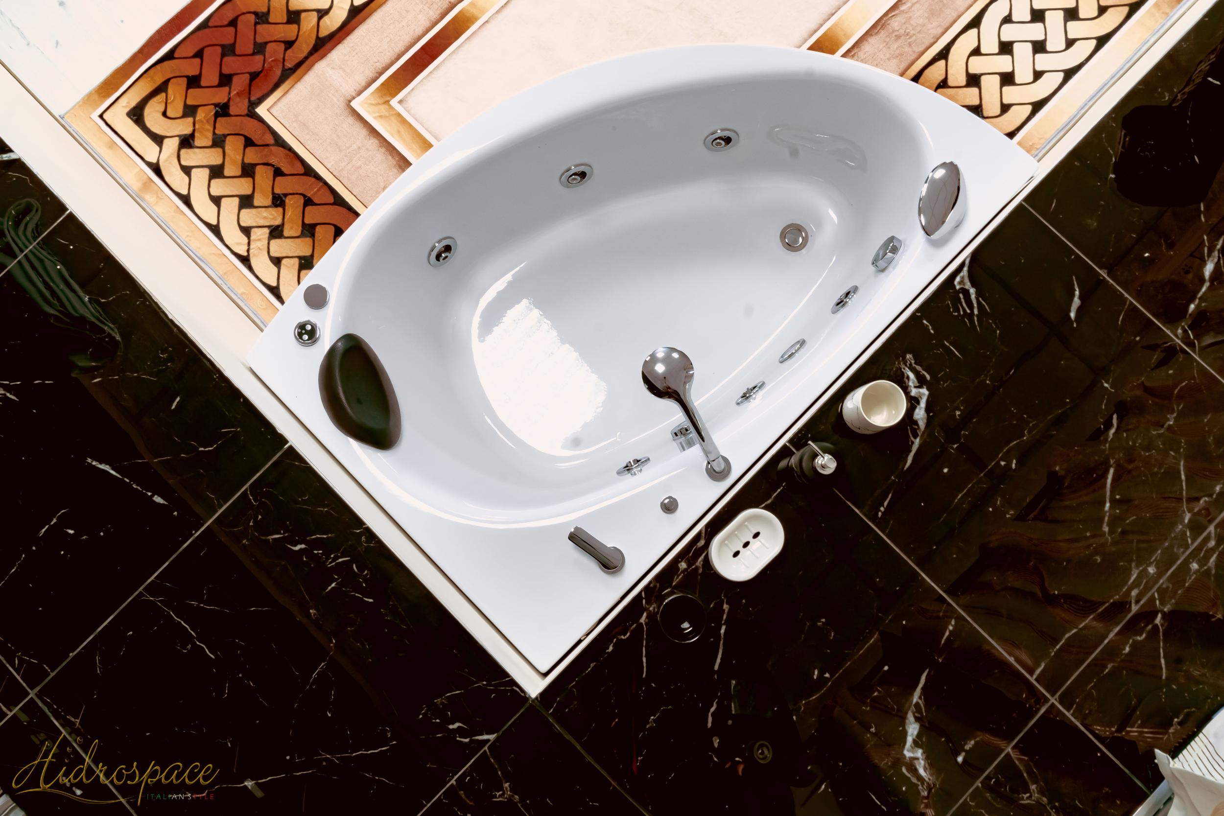 - Sistema idromassaggio Whirpool con 6 getti ad acqua e aria regolabili e richiudibili, gestito da una centralina elettronica dotata di un sensore di livello che evita l'accensione seza l'acqua, comandi di accensione digitale munito di led per segnalare la presenza di tensione elettrica e funzionamento;