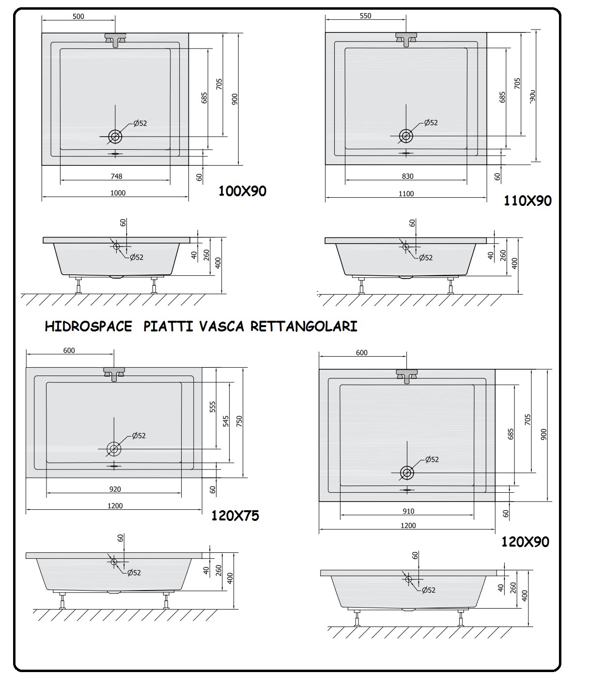 Proposta nei formati 100×75, 110×75, 120×75, oppure 100×90, 110×90 e 120×90 cm, con profondità vasca di 26 cm e altezza piatto di 40 cm. Su richiesta anche versioni 75×130 e 75×140 cm, per accogliere ogni esigenza di spazio.