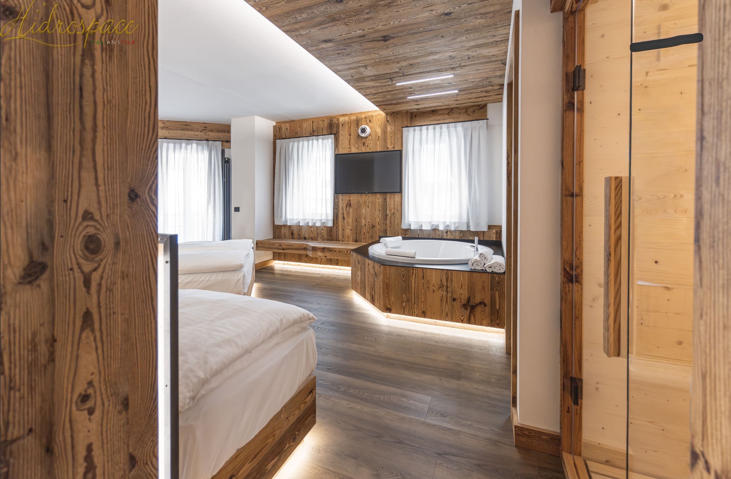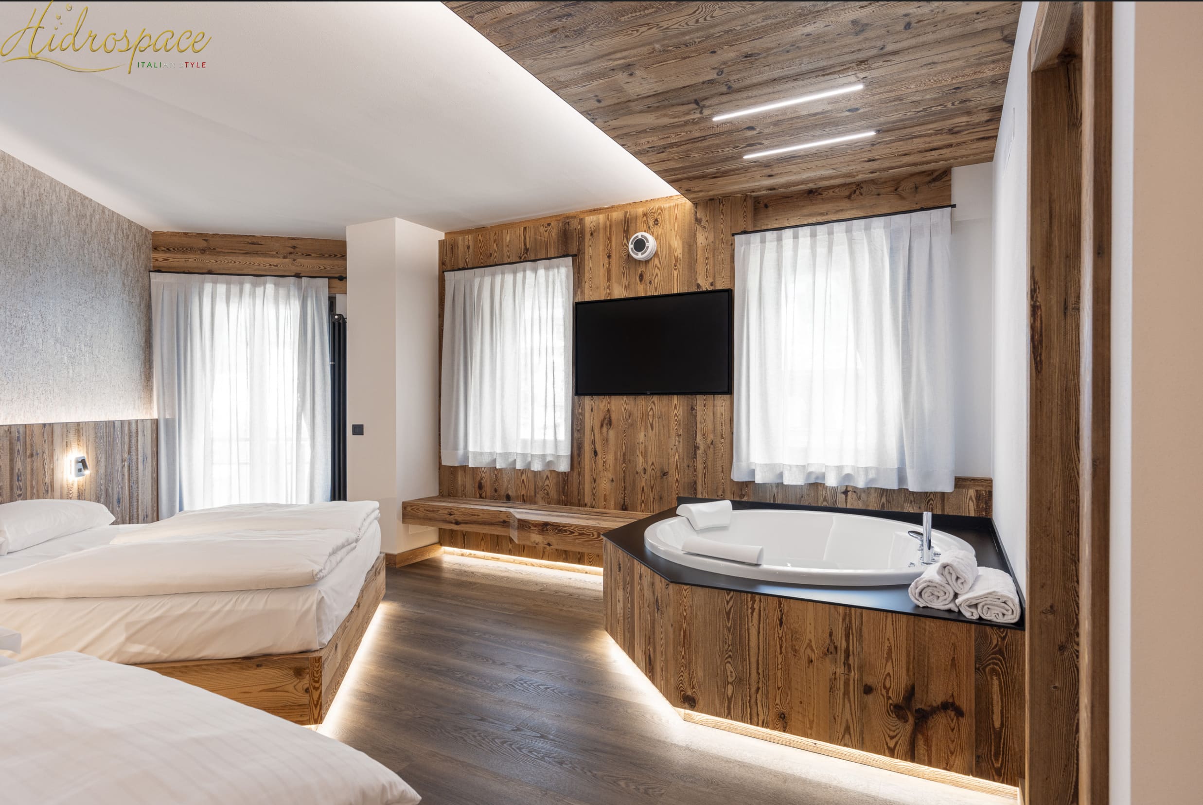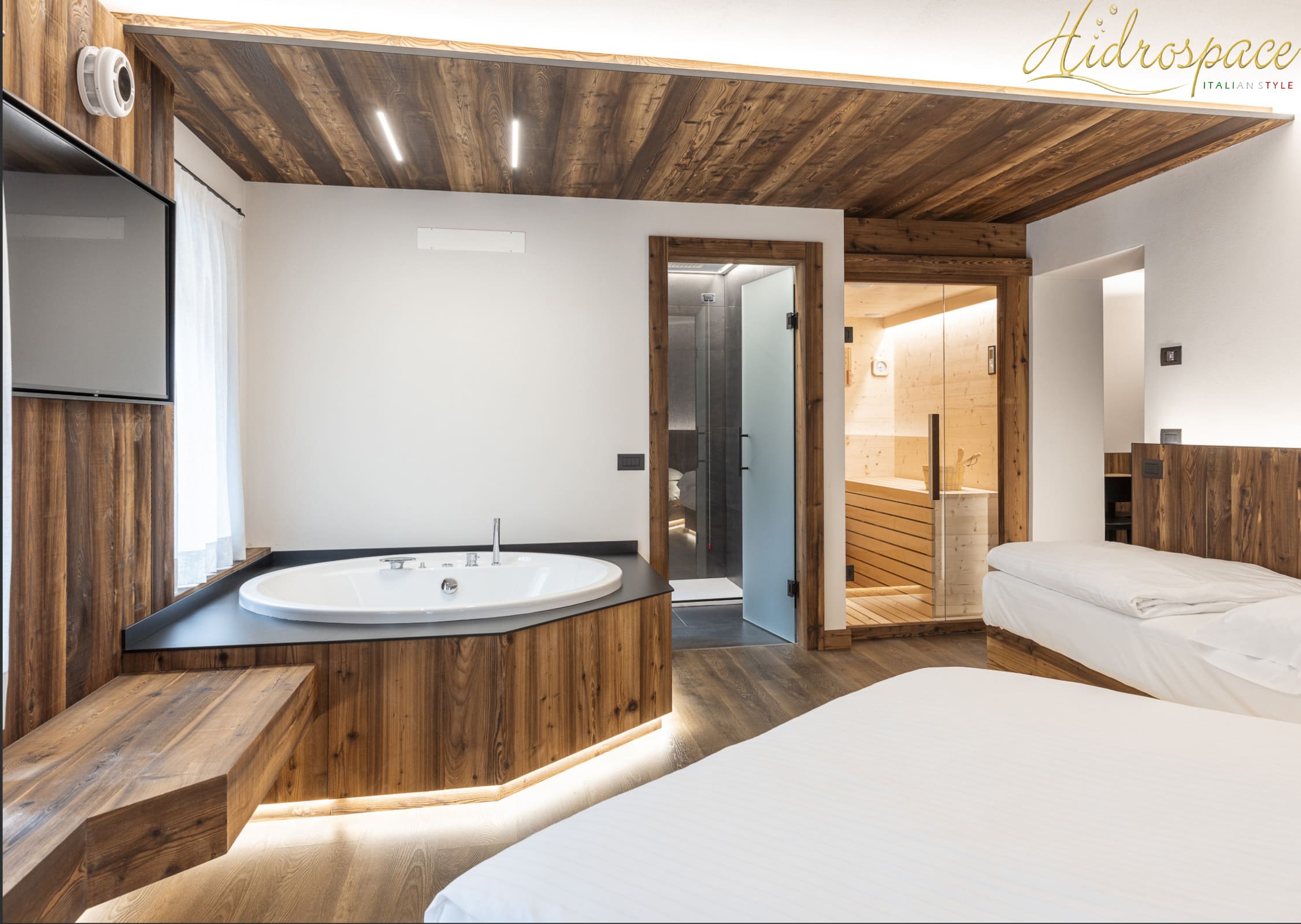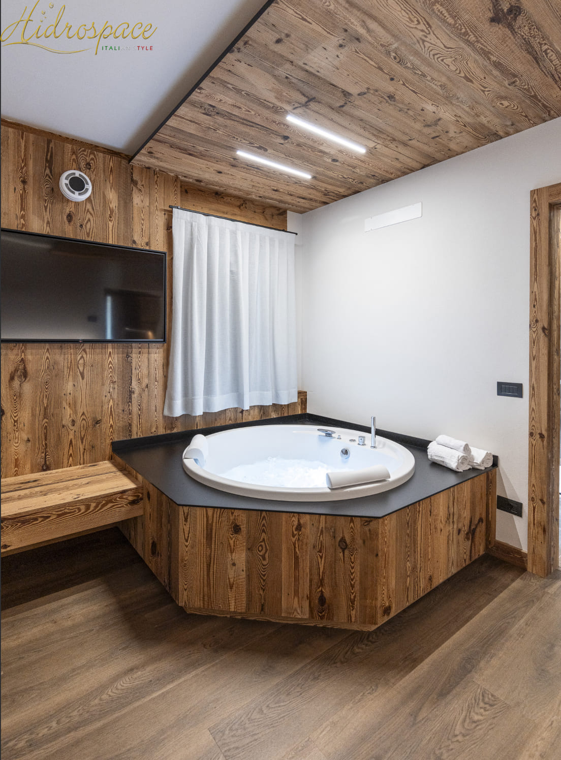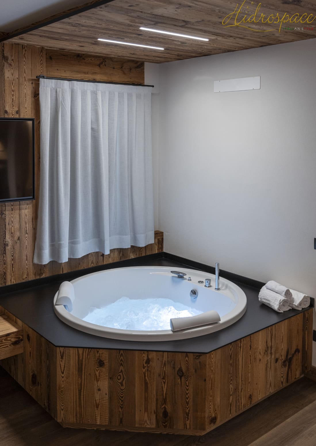 La vasca idromassaggioSUN ma grazie alle pareti laterali sagomate e poco ingombranti, questa vasca idromassaggio, permette di disporre di molto spazio. Infatti grazie a questo, anche tre persone adulte riescono a fare il bagno in assoluta comodità. I comandi e la rubinetteria sono tutti disposti in una mensola a luna ricavata in prossimitòà di una parte del bordo.