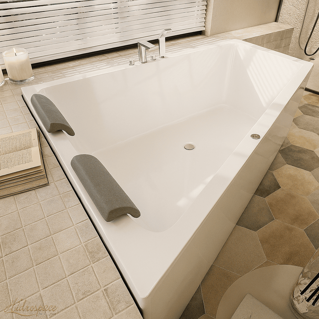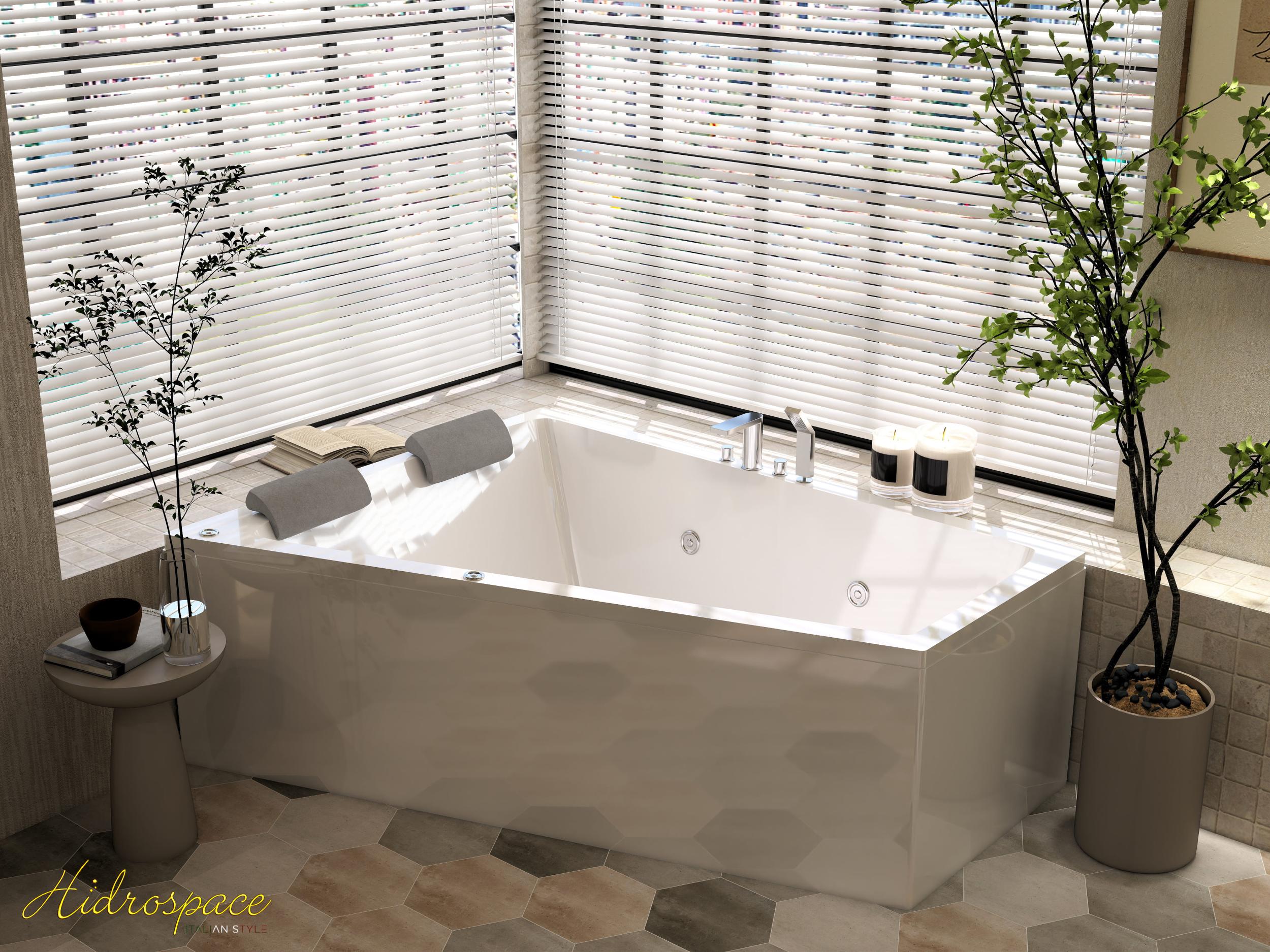 La sua struttura asimmetrica, con lato spanciato da 80 cm, consente un inserimento armonioso anche negli spazi più complessi, garantendo comunque una postura comoda e distesa durante il bagno.