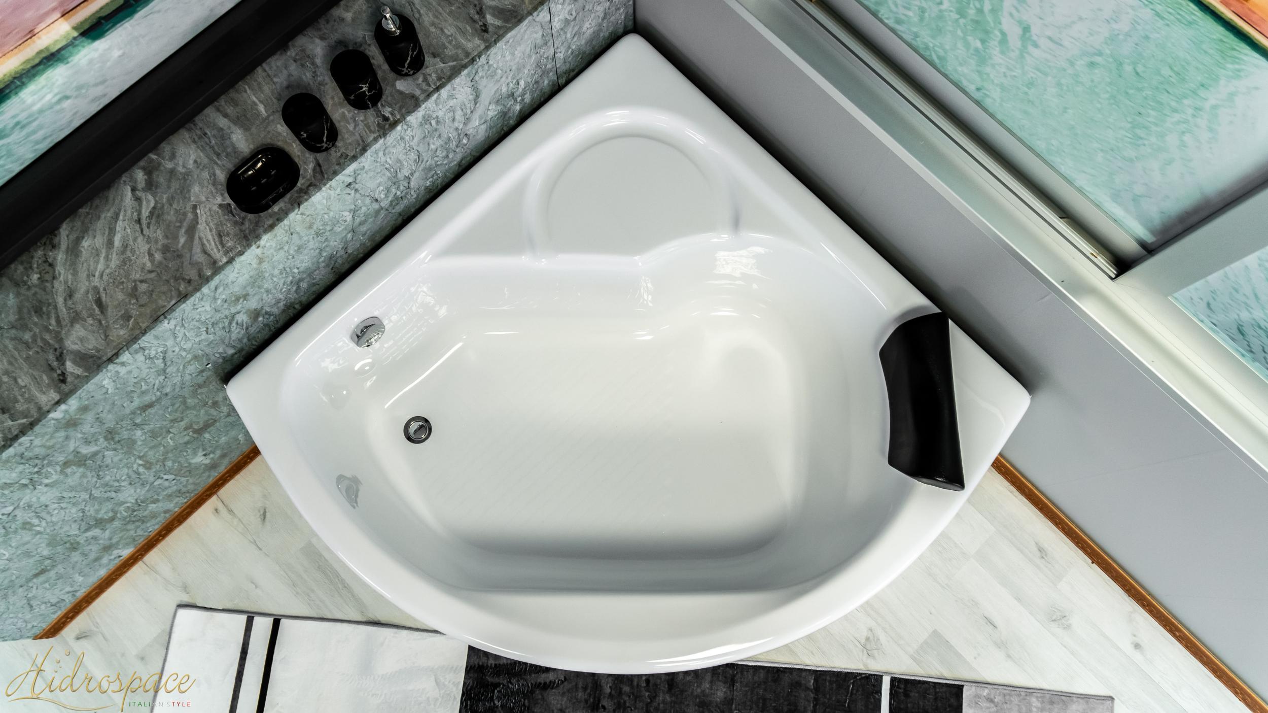 - Vasca con doppio schienale simmetrico realizzato in acrilico sanitario di primissima qualità, con pannelli rigidi sul fondo della vasca e vetroresina spruzzata esternamente;