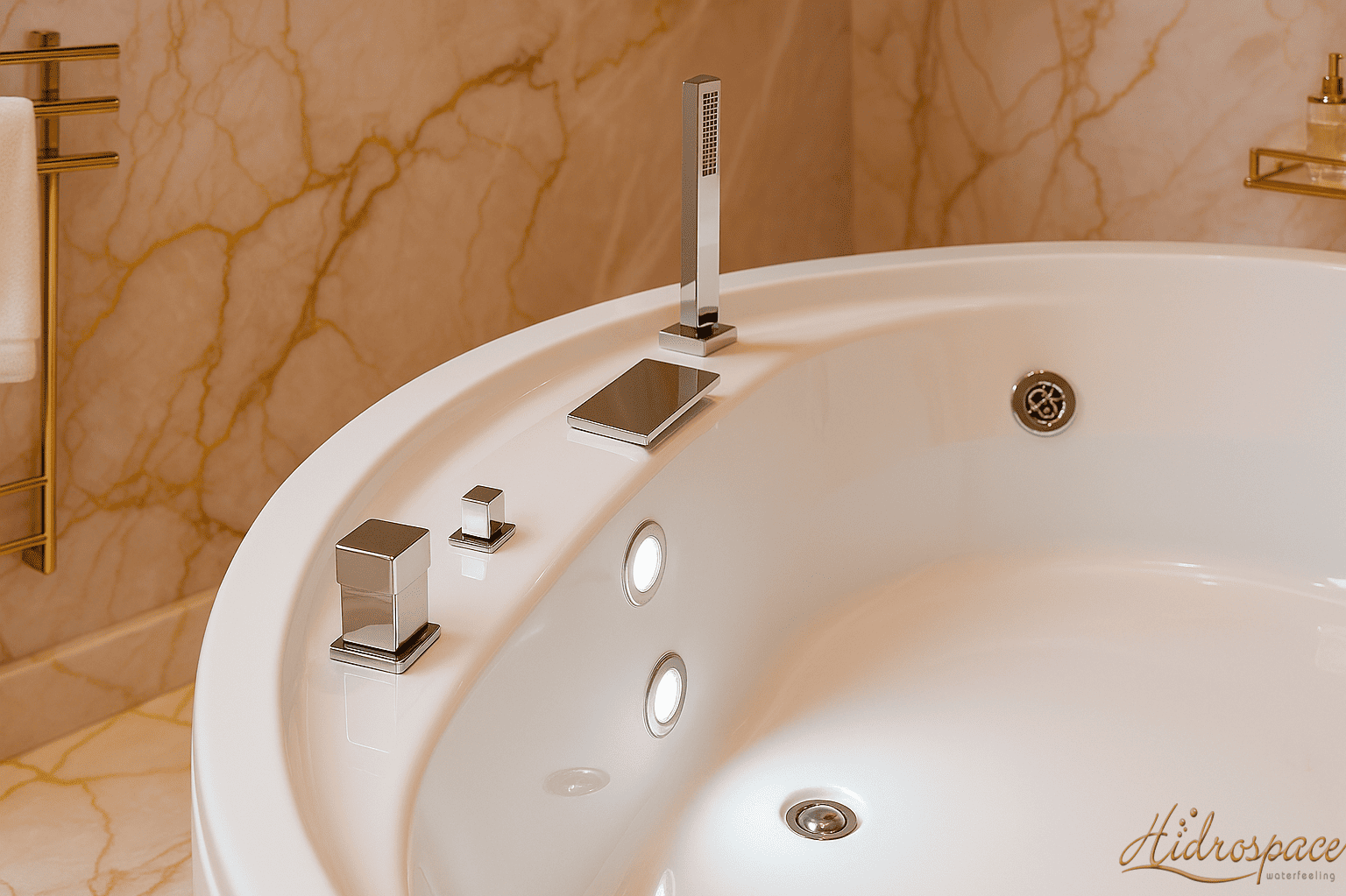 Finiture eleganti: rubinetteria di design integrata nel bordo, eleganti cromature e possibilità di rivestimenti esterni in legno per un effetto SPA domestica.